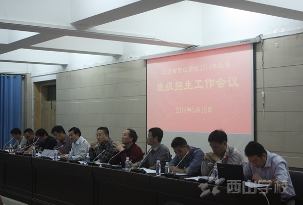 5月18日晚上,江西省西山学校召开2014年秋季班级招生工作会议。招生办主任王胜详细解读了2014年秋季班级学生介绍新生的有关规定。学校校长刘在远作了重要讲话。会议要求,全体正副班主任要讲师德,正人品,树形象,进一步团结协作,加强家校沟通交流,真心关爱学生成长,力争2014年秋季招生再创新高。小学部、初中部和高中部三学部部长及全体正副班主任参加会议。高中部袁永刚部长主持会议。