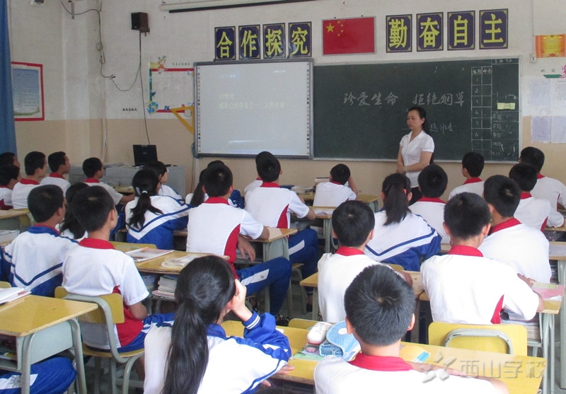 2015年5月31日是世界卫生组织发起的第28个世界无烟日。为了进一步推进文明校园、和谐校园建设,为师生营造一个良好的学习和工作环境,保障师生身体健康,5月25日上午,江西省西山学校初中部以“珍爱生命,拒绝烟草”为主题,在教学楼开展了禁烟班会课。
