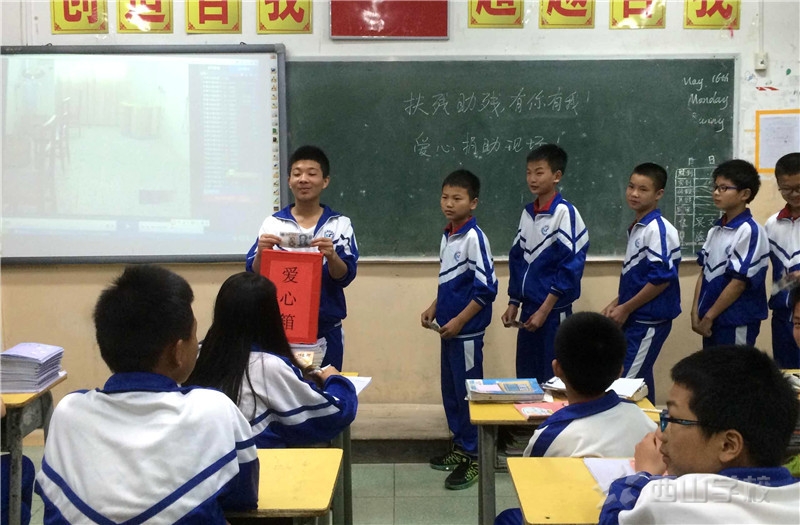 为弘扬中华民族扶残助残的传统美德,积极倡导扶残助残的良好社会风尚。 5月17日晚,西山学校初中部以班级为单位开展了“助残扶残,有你有我”主题班会活动。