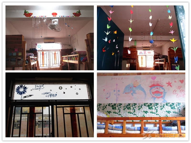 宿舍走廊上,有“初二(16)班欢迎您”几个大大的字映入眼帘,犹如学生正热烈欢迎大家到来;窗户上,有同学们精心贴上去的梅花壁纸,彰显了学生们独特的品味;室内更成为孩子们装扮的海洋,墙上、门上、镜子上.....都是他们的艺术创作。尤其是女生宿舍,温馨、整洁、美观......令人耳目一新。