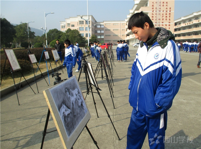 为提高学生艺术鉴赏能力,陶冶情操,丰富学生校园文化生活,1月1日,西山学校初中部组织学生前往行政楼前观看高中部举办的第一届“冬季画展”活动。