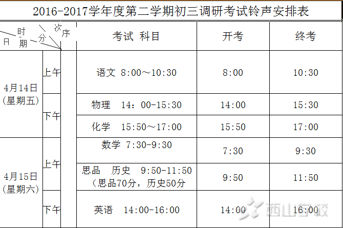 时光飞逝,转眼半个学期过去了。为检测半个学期以来教师教学效果和学生掌握所学知识的情况,江西省西山学校初中部根据南昌市教育局关于期中考试的要求与安排,定于2017年4月17日—19日,举行初中部2016—2017学年第二学期期中考试。考试科目有语文、数学、英语、物理、政治、历史、地理、生物。
